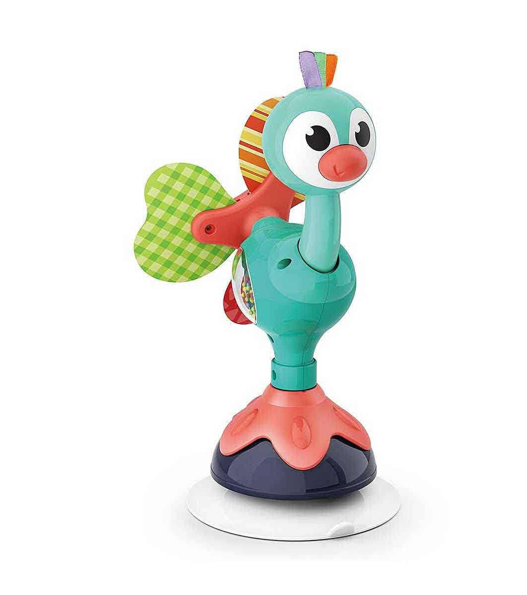 0-1 ani, 1-2 ani Distractive și colorate, această jucărie pentru bebeluși, pe lângă faptul că provoacă imaginația micuților tăi răutăcioși, este și educativă. Această jucărie este concepută pentru a se potrivi perfect pe suprafața scaunului înalt al copilului tău preferat.  Păunul vesel Pammy va fi însoțitorul fidel al bebelușului tău în timpul hrănirii. Este colorat și distractiv, are părți în mișcare, diferite suprafețe tactile și bile care zboară. Această jucărie este concepută special pentru bebelușii peste 6 luni. Comoditatea jucăriei este că este atașată în siguranță de masă printr-o ventuză. Astfel, bebelusul se va putea juca cu el in timpul meselor fara a se putea misca sau arunca. Mâncatul va fi mai distractiv și nu va mai fi o problemă. Părul și coada păunului Pammy sunt realizate din diverse materiale textile. Micuțul le va explora atingându-le. Coada este decorată cu diferite culori alb-negru care vor ajuta micuții vederea. Jucăria are părți mobile: coada se învârte; capul păunului se mișcă în sus și în jos; Întregul păun se rotește în jurul axei sale. Pubelul de păun este potrivit atât pentru fete, cât și pentru băieți, iar la fabricarea sa se folosesc plastic și materiale textile de calitate extrem de înaltă. Dimensiuni jucarie: 20 x 12 x 10 cm Potrivit pentru copii peste 6 luni.