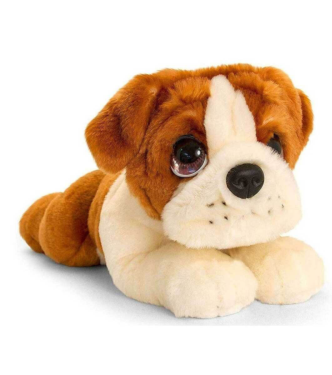 Keel Toys Jucărie de plus Bulldog culcat 25 cm Cățeii din seria Cuddle Puppies de la compania britanică de jucării de pluș Keel Toys sunt frumoși și realiști, au ochi triști și umezi, labe grele și un corp moale. Bulldogul este un câine cu o dispoziție calmă. Câinele este puternic atașat de stăpâni, așa că nu este o idee bună să-și schimbe casa și familia. Un câine cu un temperament bun, se înțelege bine atât cu oamenii, cât și cu alți câini. Îi place să călătorească cu stăpânii săi.