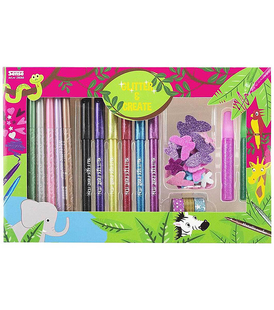 Setul include: 6 pixuri cu pâslă cu efect metalic; 6 pixuri cu efect de sclipici; 2 bucăți de lipici cu sclipici; 3 role de bandă decorativă cu efect de sclipici; Autocolante strălucitoare în diferite forme.