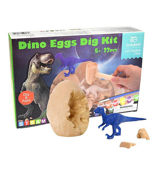 Micul arheolog va pleca în propria aventură și va dezvălui ce se află în interiorul ouălor. Trebuie doar să spargă oul de lut pentru a dezvălui dinozaurul și apoi să-l coloreze. Acest pachet este atât educațional, cât și distractiv.