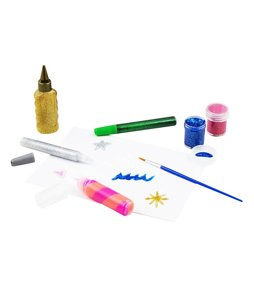 Sense Kit de vopsire și aplicații cu sclipici Și lasă totul să strălucească... Creioanele cu sclipici sunt modul tău preferat de a te exprima Acest set este doar pentru tine? Poți desena o felicitare pentru mama ta sau pentru un prieten care te-a invitat în vacanță pe neașteptate.