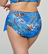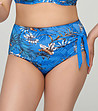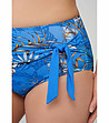 Slip cu talie mare, cu volanuri decorative și curea detașabilă pentru cravată pe o parte. Tot imprimat. Tăitură joasă a picioarelor și acoperire completă a fundului. Captusita complet pentru suport dublu.