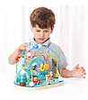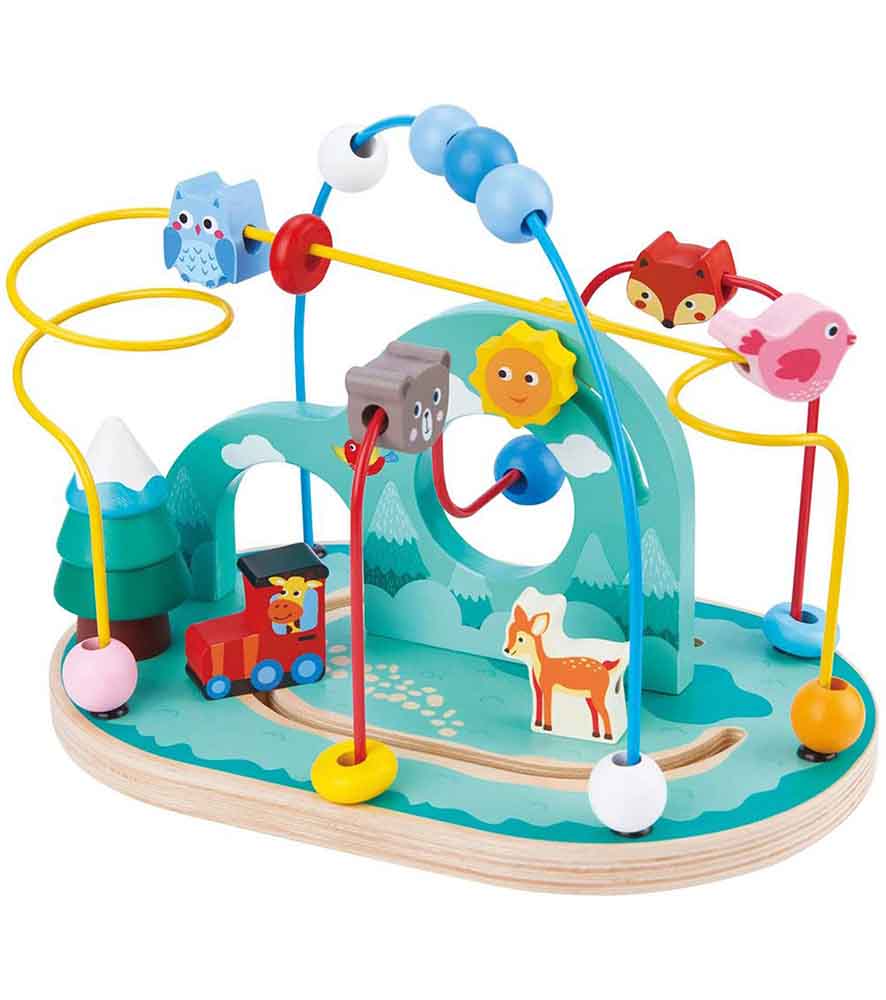 Labirintul din lemn Pădurea fermecată are 18 margele din lemn de forme diferite, cu animale din pădure, un soare și un tren și trei inele de plastic care se rotesc și alunecă.