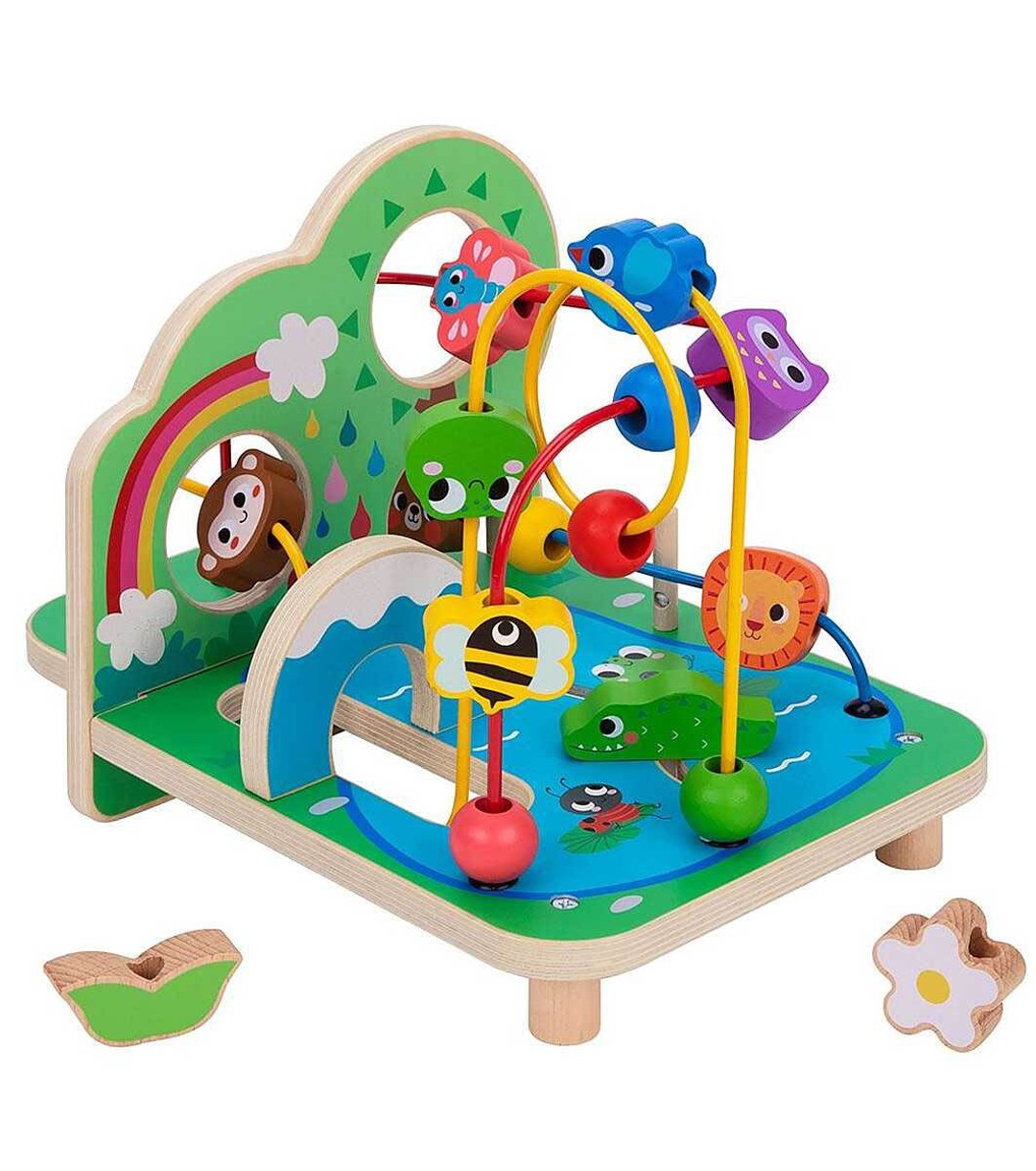 Tooky Toys Labirint din lemn Aventuri în junglă Un labirint colorat și vesel îi va duce pe cei mici prin junglă. Îi va provoca să înoate în ape cu crocodilul, să treacă sub curcubeu cu maimuța, să se joace după leul, albina, ursul.... În timp ce învață să manevreze prin labirinturi, micuțul își va exercita abilitățile motorii și de coordonare, de percepție și vizuală. Dimensiuni pachet: 29,5 x 21,2 x 20,5 cm;