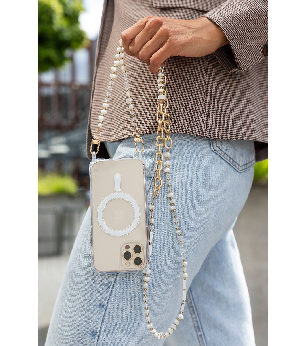 Lanțul este potrivit pentru huse de telefon cu găuri la capete (așa cum se vede în fotografie) sau „inele” sau „urechi” care ies din husă, de care se pot atașa carabinierele.