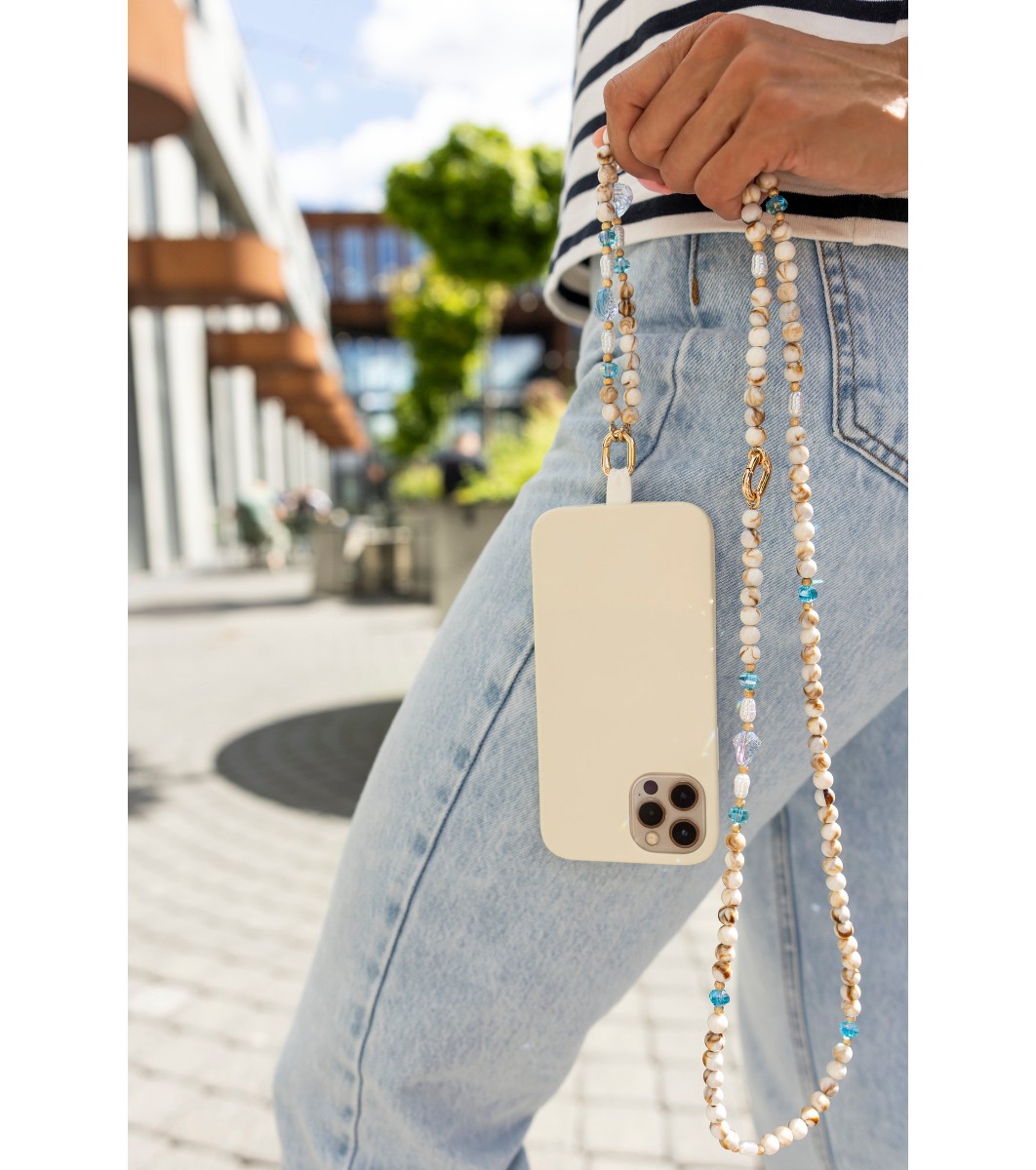 Lanț de telefon cu mărgele bej și detalii din sticlă