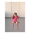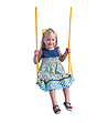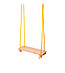 Leagănul este din lemn, frânghiile la capătul de sus cu inele pentru agățat.