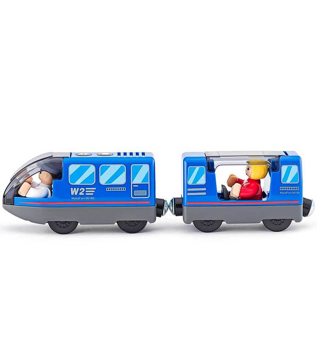 Un tren modern de pasageri cu șofer, pasageri și cabine cu deschidere în sus. Magneții conectează locomotiva și vagonul, iar bateriile asigură semnalizarea sonoră.