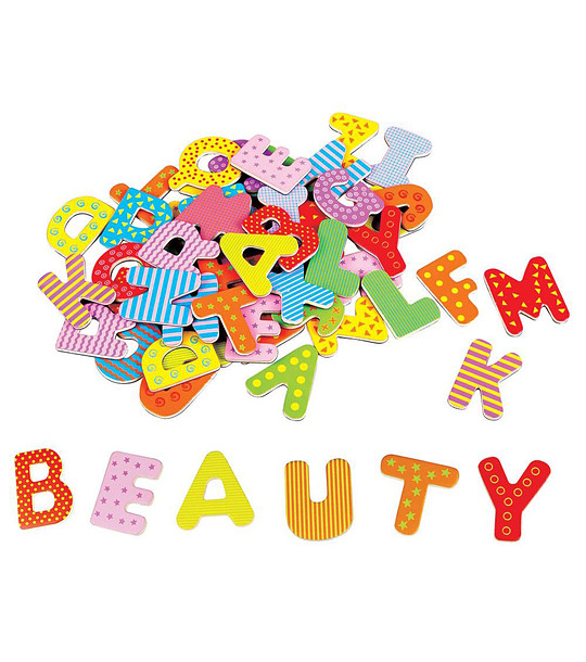 Literele sunt colorate, din lemn și folie magnetică. Literele folosite mai des sunt repetate de două sau trei ori. Sunt ambalate într-o cutie frumoasă, colorată.