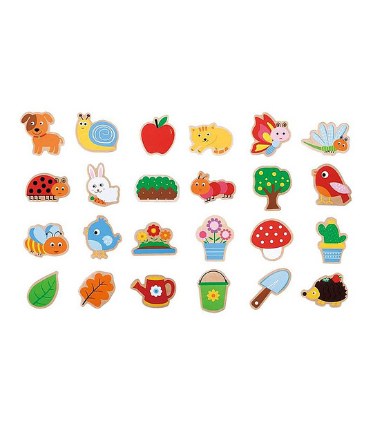 Setul conține 24 de figuri magnetice din lemn diferite cu imagini cu animale, plante și obiecte găsite în grădină.