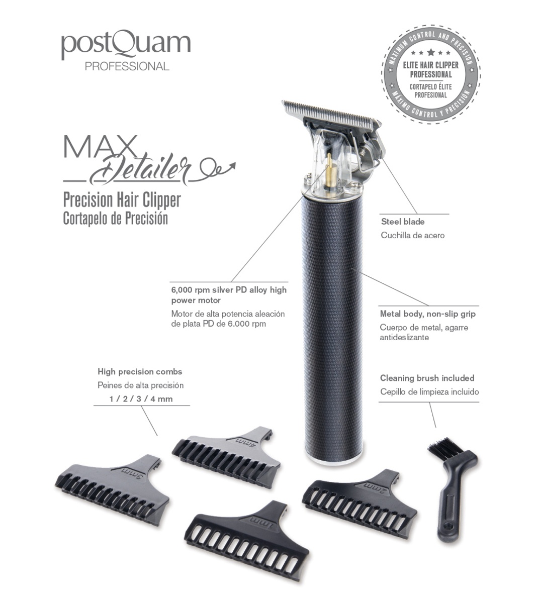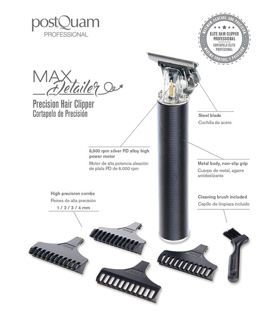 Mașină de tuns și detailing profesională MAX DETAILER cu motor de înaltă performanță și lamă din oțel. Echipată cu 4 piepteni interschimbabili pentru tăierea lungimilor de 1 / 2 / 3 / 4 mm, perie de curățare și ulei de lubrifiere incluse. Corp metalic ergonomic cu strat antiderapant.