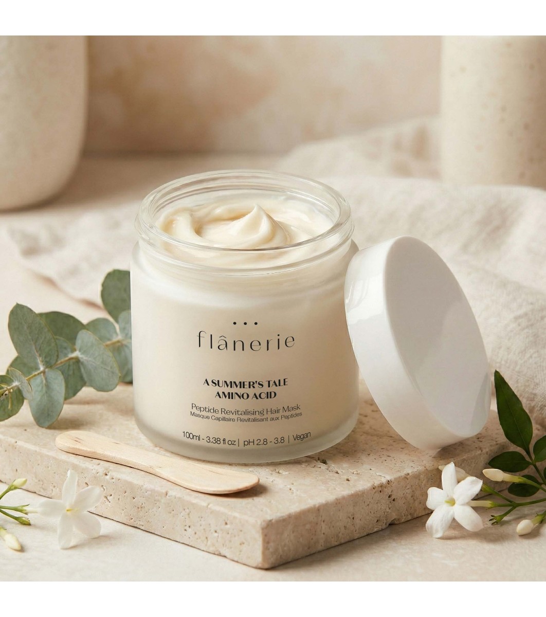 Flanerie Mască de păr cu peptide 100 ml Mască de păr cu peptide într-un borcan cu capac cu filet.