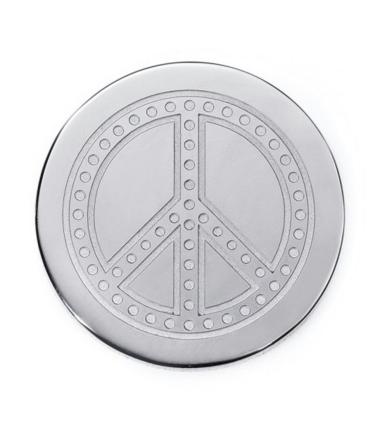 Medalion rotund cu o emblemă a păcii gravată în centru.