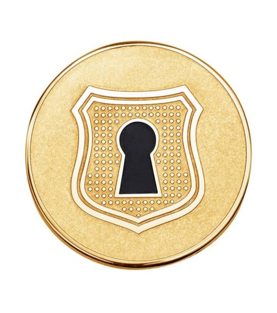 Un medalion cu design unic, cu un lacăt în centru. Suprafața este gravată cu detalii precise care creează un efect vizual interesant.