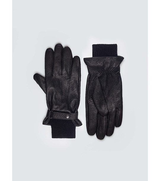 Mănuși bărbătești din piele cu curea reglabilă și închizătoare metalică tic-tac în zona încheieturii mâinii.