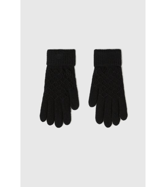 Moodo Mănuși negre de damă cu relief tricotat Mănuși tricotate de damă cu degete lungi și manșete rulate. Partea superioară are un motiv tricotat romboidal în relief.