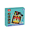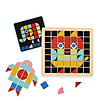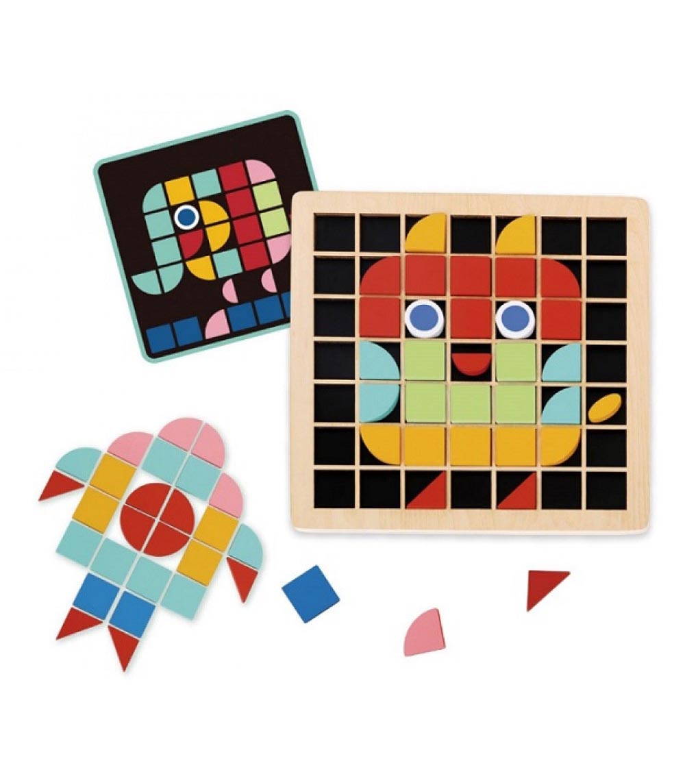 Setul este format din 97 de piese. Proiectata pentru ore de joaca si ideala pentru a se juca atat acasa cat si in deplasare, aceasta jucarie din lemn include 15 foi tiparite fata-verso cu modele gata facute si 80 de placi din lemn de diferite culori si forme. Copiii se vor bucura să folosească figurile pentru a copia 30 de imagini diferite folosind cardurile de probă. Mai târziu, copiii vor încerca să vină cu propriile lor desene și picturi.