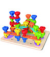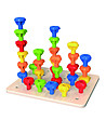 Activități de dezvoltare: sortarea și recunoașterea culorilor și formelor, aranjarea după un model - bazat pe modelul din cartonașe construcție liberă cu cuie și platforme exerciții pentru concentrare, coordonare și dexteritate Materiale sigure și de calitate: elemente din lemn și plastic de înaltă calitate, sigure pentru copii, materiale și vopsele non-toxice cartonașe din carton gros, rezistent la îndoire
