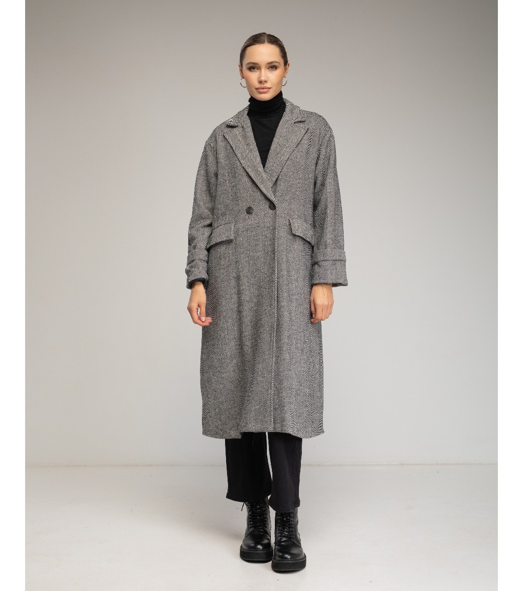 Palton de damă cu structură herringbone în melanj negru