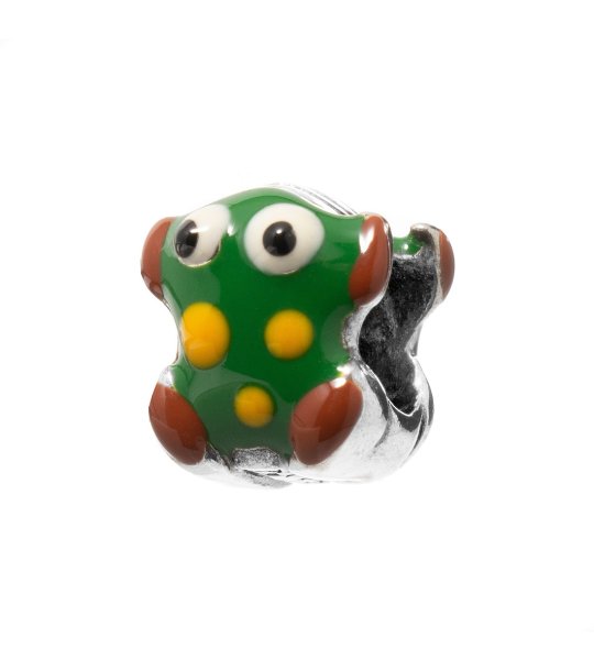 O mărgele în formă de broască, potrivită pentru brățări. Designul include detalii amuzante și caracteristici expresive.