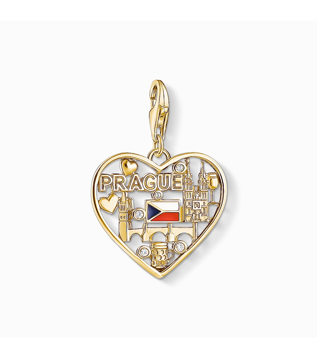 Pandantiv în formă de inimă cu detalii legate de Praga. Include motive cu repere celebre și mici elemente decorative. Închizătoarea este de tip „mousqueton”.