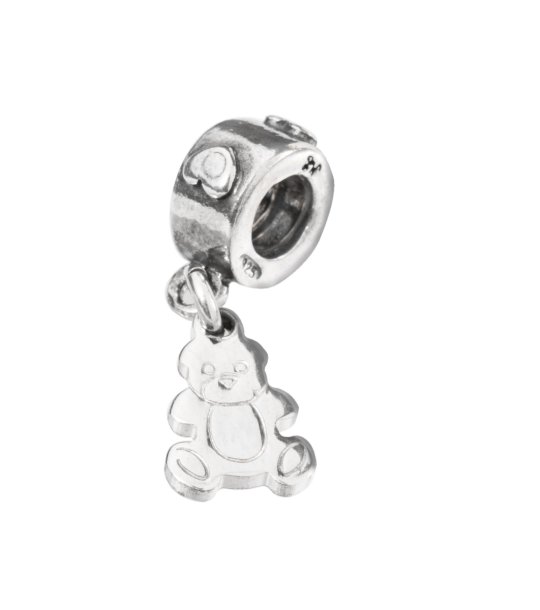 Un pandantiv în formă de urs atașat la un element rotund cu găuri. Detaliile includ motive în formă de inimă pe element.