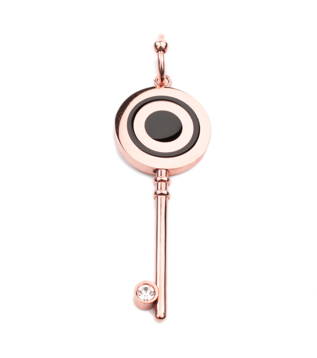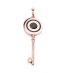 Un pandantiv elegant în formă de cheie, decorat cu un element rotund în centru. Designul include o mică pietricică în partea de jos