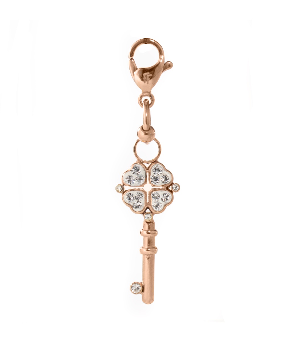 Element decorativ în formă de cheie, decorat cu motive florale. Prevăzut cu o încuietoare tip carabină pentru o prindere ușoară.