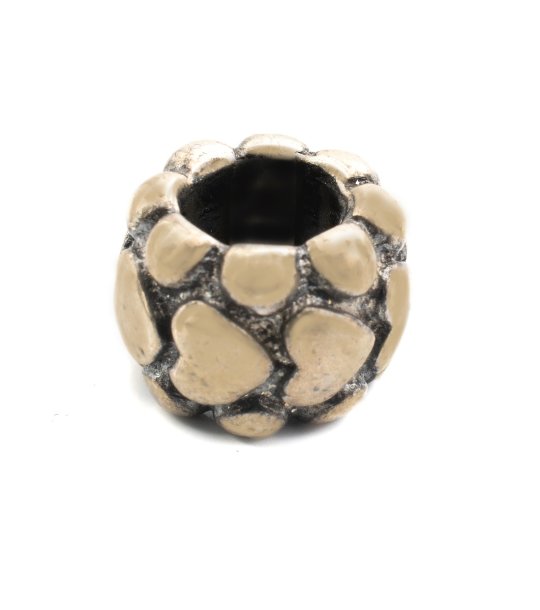 Păiantiu sferic decorat cu mai multe elemente proeminente în formă de inimă.