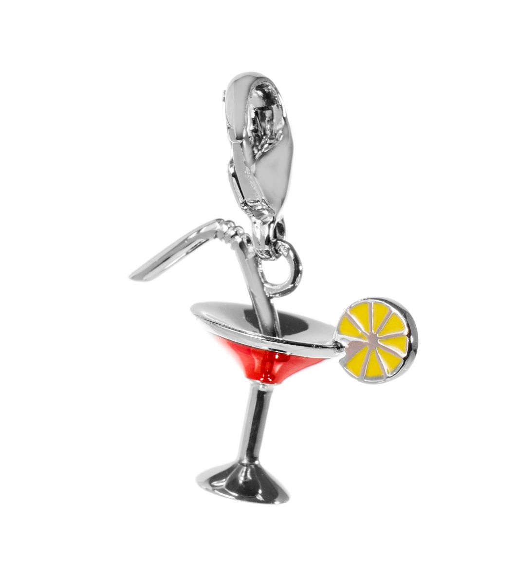Un pandantiv în formă de pahar cocktail, potrivit pentru o brățară. Lucrare detaliată cu o felie decorativă de lămâie și un pai.