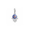 Un pandantiv fermecător în formă de mână, decorat cu un element rotund în centru. Are o încuietoare pentru atașarea ușoară la brățări sau coliere.