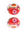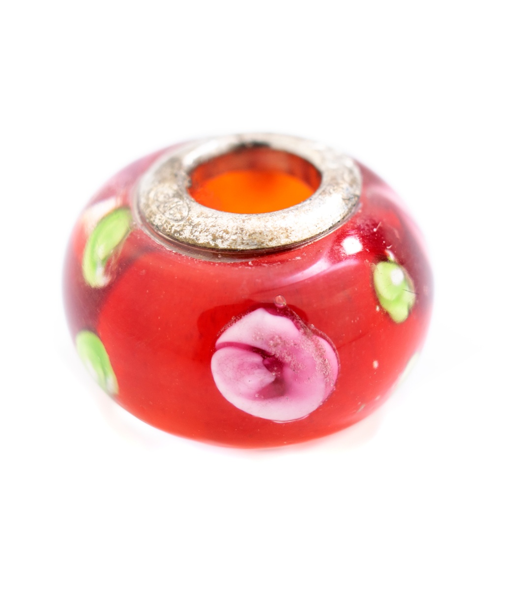 Această mărgele are formă rotundă și are elemente decorative sub formă de flori. Gaura centrală este înconjurată de o margine metalică, ceea ce facilitează înșirarea.