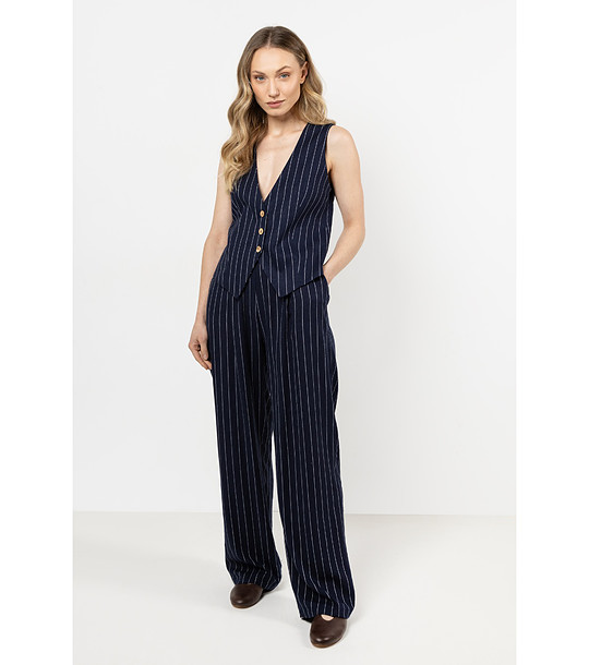 Pantaloni din in cu dungi late în dungi delicate Acești pantaloni sunt combinația perfectă între eleganță și confort de zi cu zi. Confecționați din in, oferă respirabilitate și se mulează perfect pe siluetă. Picioarele late adaugă libertate, iar o bandă elastică în talie garantează o potrivire perfectă. Modelul clasic cu dungi subțiri îi face să se potrivească cu multe stiluri. Combină pantalonii din in cu o vestă sau o jachetă din același material și vei crea un look elegant de vară. Caracteristici produs:• Croială: Pantaloni elastici, cu picioare late• Material: In• Închidere: Bandă elastică în talie• Accesorii: Bretele subțiri negre• Stil: Elegant, modern, confortabil• Ocazii: Pentru serviciu, întâlniri, călătorii de vacanță Producție poloneză: Pantalonii au fost cusuți în Polonia cu cea mai mare grijă, ceea ce garantează durabilitatea și manopera excelentă. Material: 85% viscoză, 15% inMărimea prezentată: S, înălțimea modelului: 167 Pantaloni din in cu dungi late în dungi delicate Acești pantaloni sunt combinația perfectă între eleganță și confort de zi cu zi. Confecționați din in, oferă respirabilitate și se mulează perfect pe siluetă. Pantalonii lați adaugă libertate, iar talia elastică garantează o potrivire perfectă. Modelul clasic cu dungi subțiri îi face să se potrivească cu multe stiluri. Combină pantalonii din in cu o vestă sau o jachetă din același material și vei crea un look elegant de vară. Caracteristici produs: • Croială: Pantaloni elastici, talie lată • Material: In • Închidere: Talie elastică • Accesorii: Bretele negre subțiri • Stil: Elegant, modern, confortabil • Ocazii: Pentru serviciu, întâlniri, călătorii de vacanță Producție poloneză: Pantalonii au fost cusuți în Polonia cu cea mai mare grijă, ceea ce garantează durabilitatea și manopera excelentă. Material: 85% viscoză, 15% in Mărimea prezentată: S, înălțimea modelului: 167