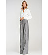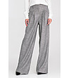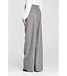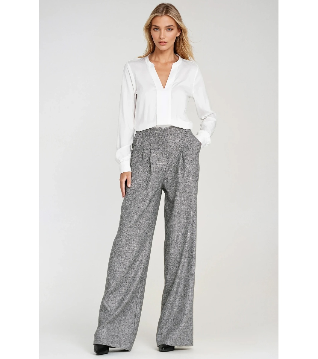 Croială lejeră. Confecționată dintr-un material cu textură melanj, de culoare neuniformă. Design cu talie înaltă. Pliuri decorative în față. Siluetă largă, cu croială lungă și lejeră. Închidere frontală cu fermoar și nasture. Buzunare clasice în față și buzunare false în spate. Gaici pentru curea în talie.