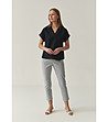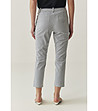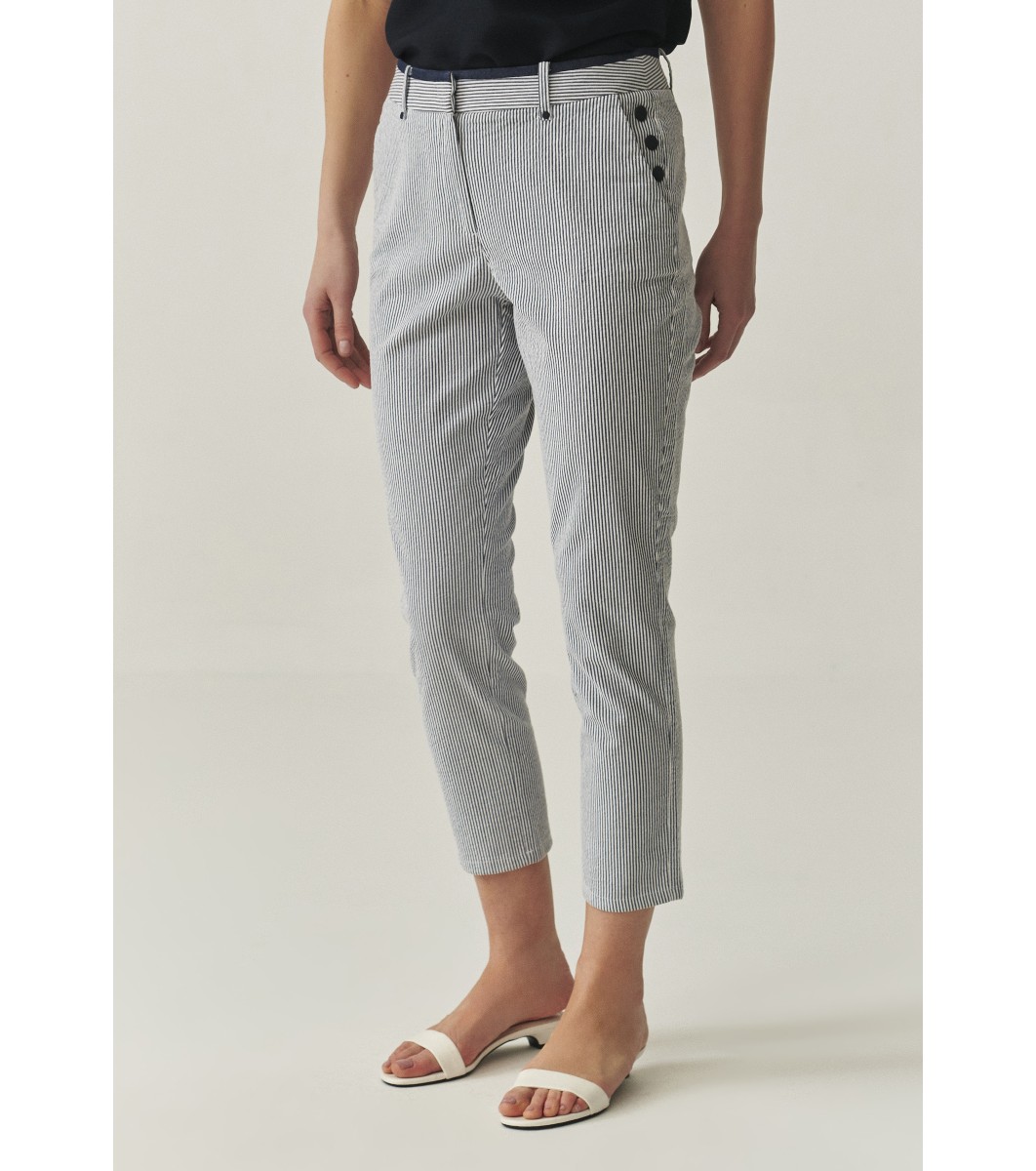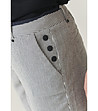 Pantaloni de damă cu o croială dreaptă, ușor conică, până la gleznă. Închidere cu fermoar și nasturi în față. Talie elastică cu găici pentru curea. Două buzunare laterale și două buzunare decorative la spate. Nasturi decorativi în zona șoldurilor, pe ambele părți.