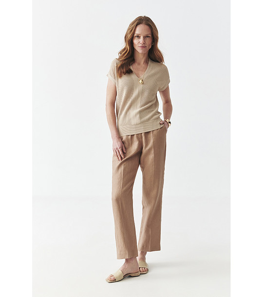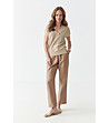 Pantaloni drepți pentru femei, lungime până la gleznă. Modelul are talie înaltă, găici pentru curea și închidere cu fermoar și nasturi în față. Prezintă un tiv în față și două buzunare laterale.