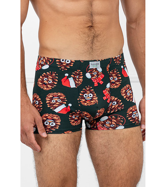 Pantaloni boxer bărbătești cu talie elastică. Imprimeu integral cu conuri de pin și motive de sărbători. Picior scurt, mulat. Etichetă cu logo pe talia din față.