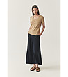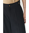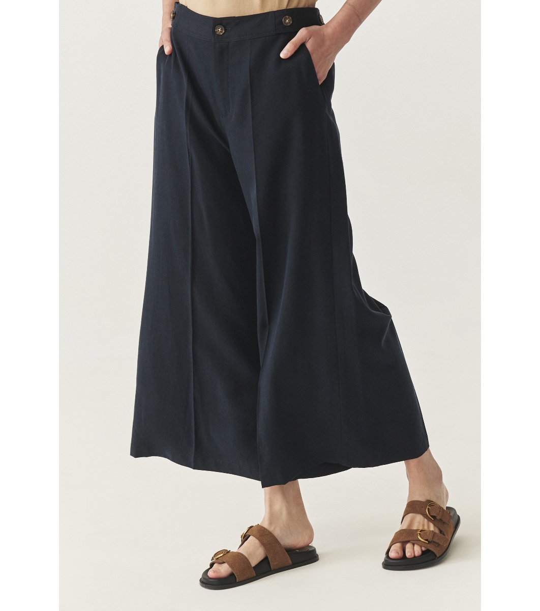 Pantaloni culotte pentru femei cu talie înaltă. Lungime lată până la gleznă. Închidere cu fermoar și nasturi în față. Buzunare laterale cusute. Nasturi decorativi în partea de sus a curelei. Partea netedă în față și în spate, cu pliuri ușoare de-a lungul picioarelor. Două buzunare cu refileți în spate.