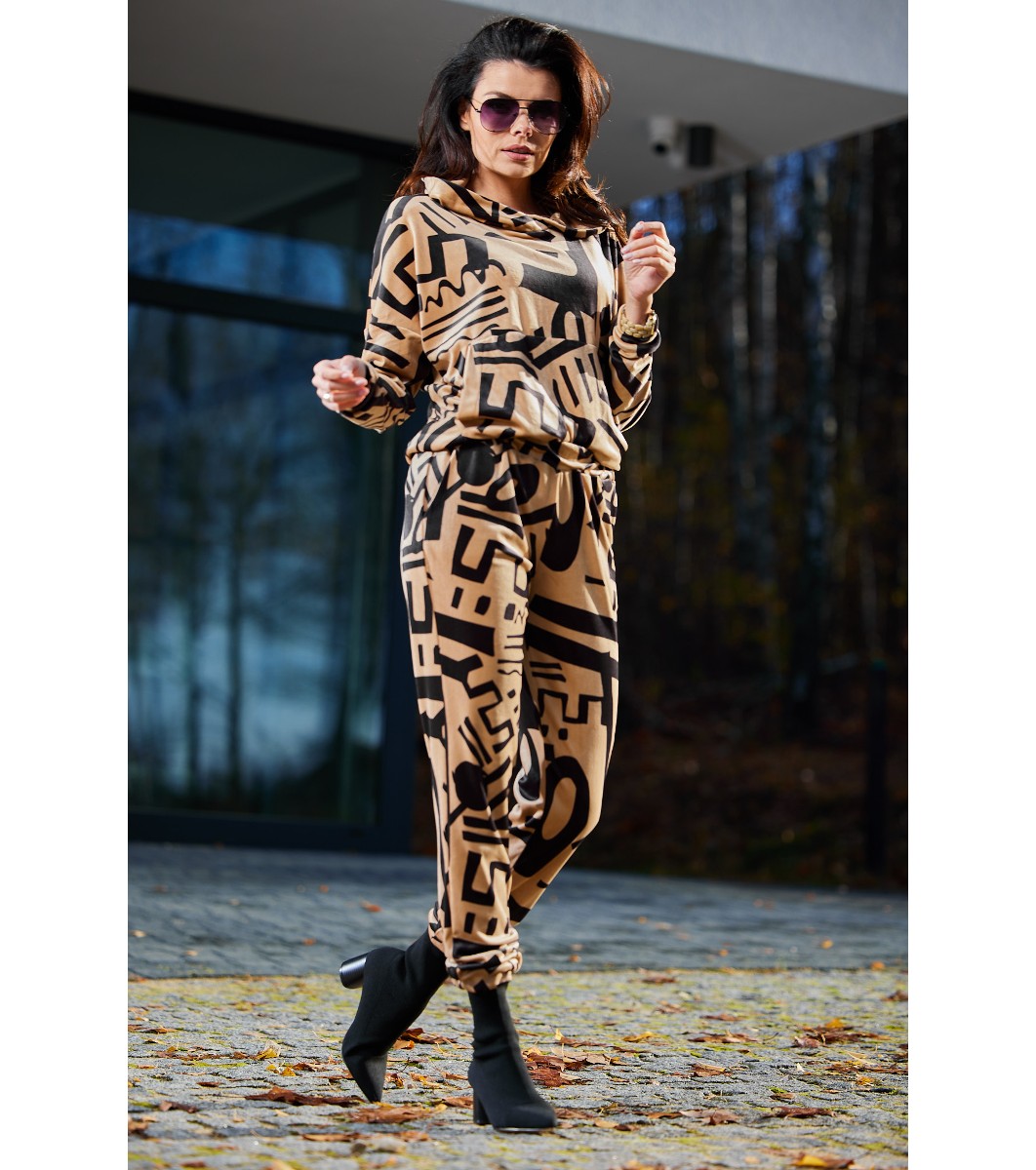 Awama Pantaloni de damă bej și negru cu imprimeu Talie elastică