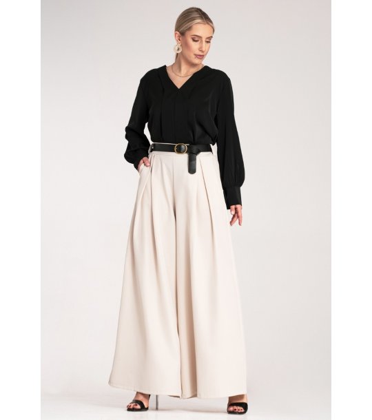 Pantaloni cu talie înaltă și talie lată. Talie elastică, completată de o curea cu cataramă. Buzunare laterale pentru confort sporit.