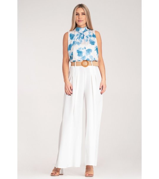 Pantaloni cu talie largă cu curea decorativă tricotată. Materialul ușor și croiala lejeră oferă confort, în timp ce pliurile fine adaugă eleganță.