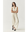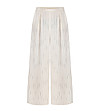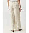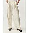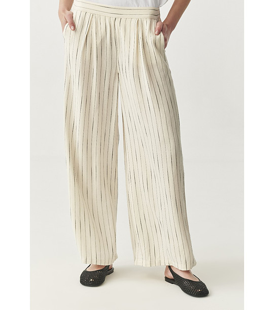 Pantaloni de damă cu talie înaltă și croială lată. Modelul are dungi verticale fine, pliuri în față și o închizătoare ascunsă în față. Există buzunare laterale și buzunare decorative cu refileți la spate. Cureaua are spate parțial elastic.
