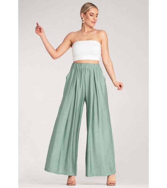 Pantaloni de damă ușori și largi, cu talie înaltă și bandă elastică. Modelul are pliuri și o croială lejeră, oferind confort și libertate de mișcare.