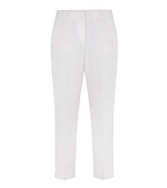 Pantaloni cu talie dreaptă, ușor conică, până la gleznă. Talie medie-înaltă cu găici pentru curea. Închidere cu fermoar și nasturi ascunși în față. Buzunare laterale și buzunare decorative cu refileți la spate. Săgeată fină de-a lungul picioarelor.