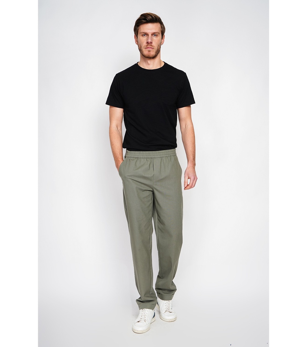 Secret Du Lin Pantaloni kaki bărbătești cu talie elastică, confecționați din in și bumbac Pantaloni lungi semi-mulați.