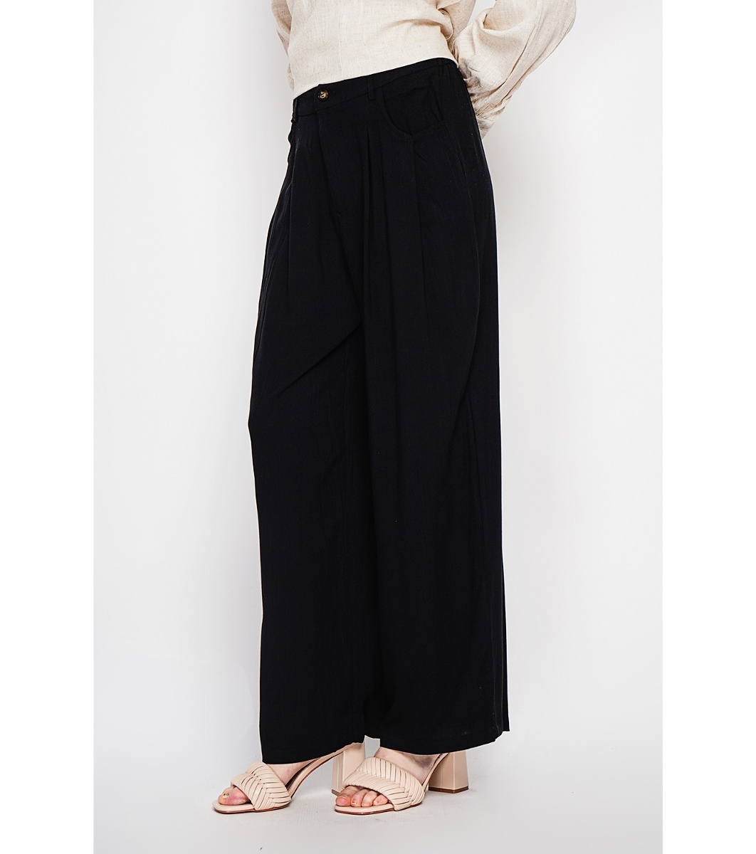 Pantaloni largi negri pentru femei, confecționați din in și bumbac
