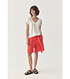 Pantaloni scurți cu croială dreaptă și lejeră până la genunchi. Modelul are talie înaltă, curea în talie pentru legare și nuci. Există buzunare cu refilet și laterale în față și buzunare cu refilet în spate.