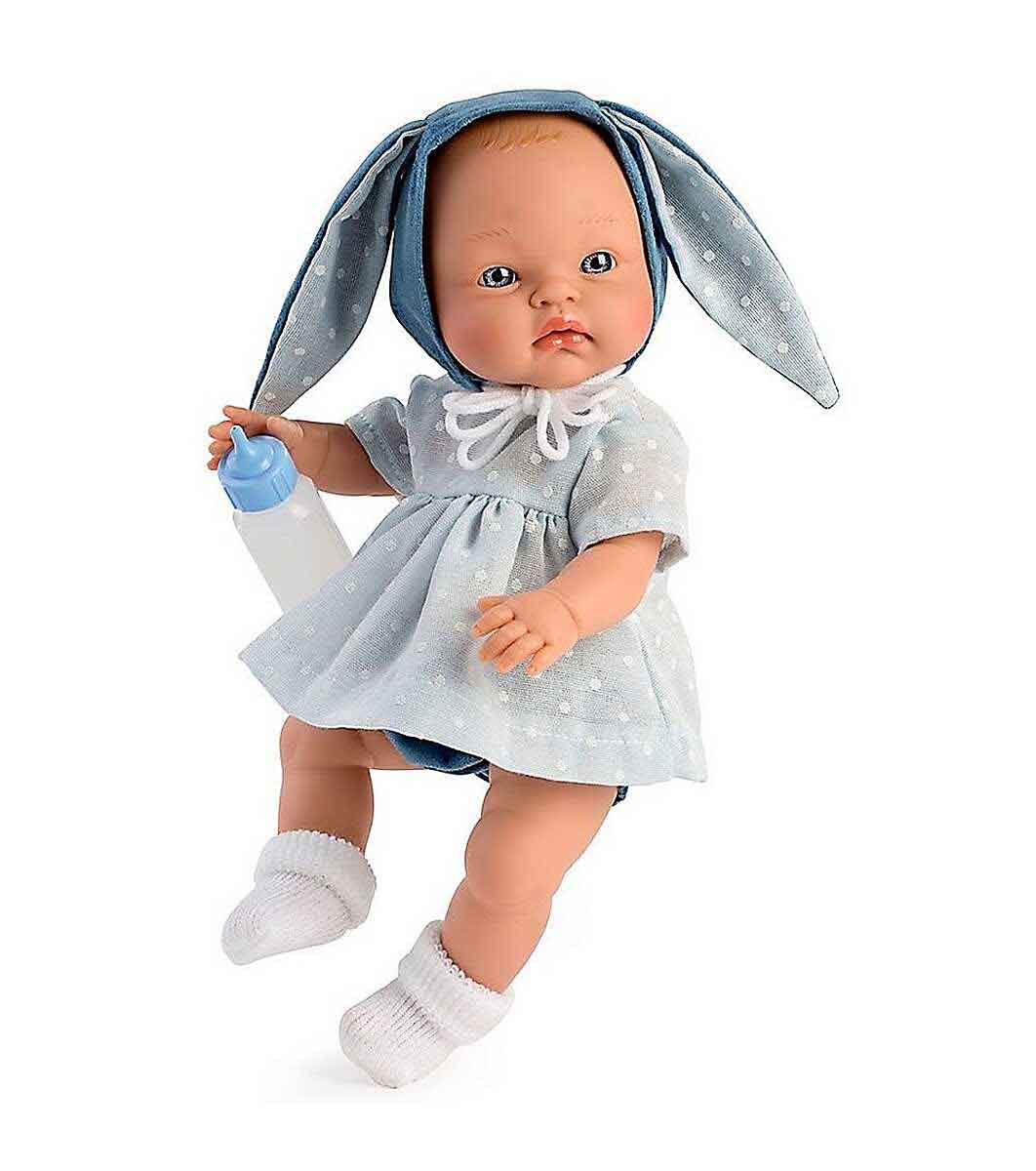 Ea poartă o rochie albastră, șosete și o pălărie de iepuraș. Are propria suzetă pe care o poți pune în gură.
