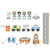 Setul include: 14 figurine - roboți, astronauți și extratereștri; vehicule spațiale mobile din lemn; barieră, lift și platformă de aterizare a rachetei; niveluri de parcare pentru o rachetă și un OZN.