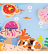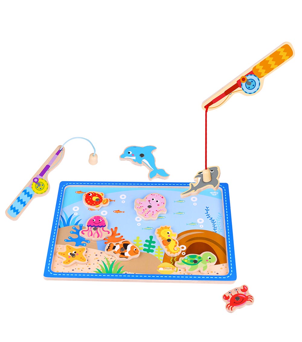 Setul este format dintr-o tabla de joc din lemn reprezentand fundul mării, 10 pesti si animale de mare din lemn colorati si doua tije din lemn cu vârfuri magnetice.